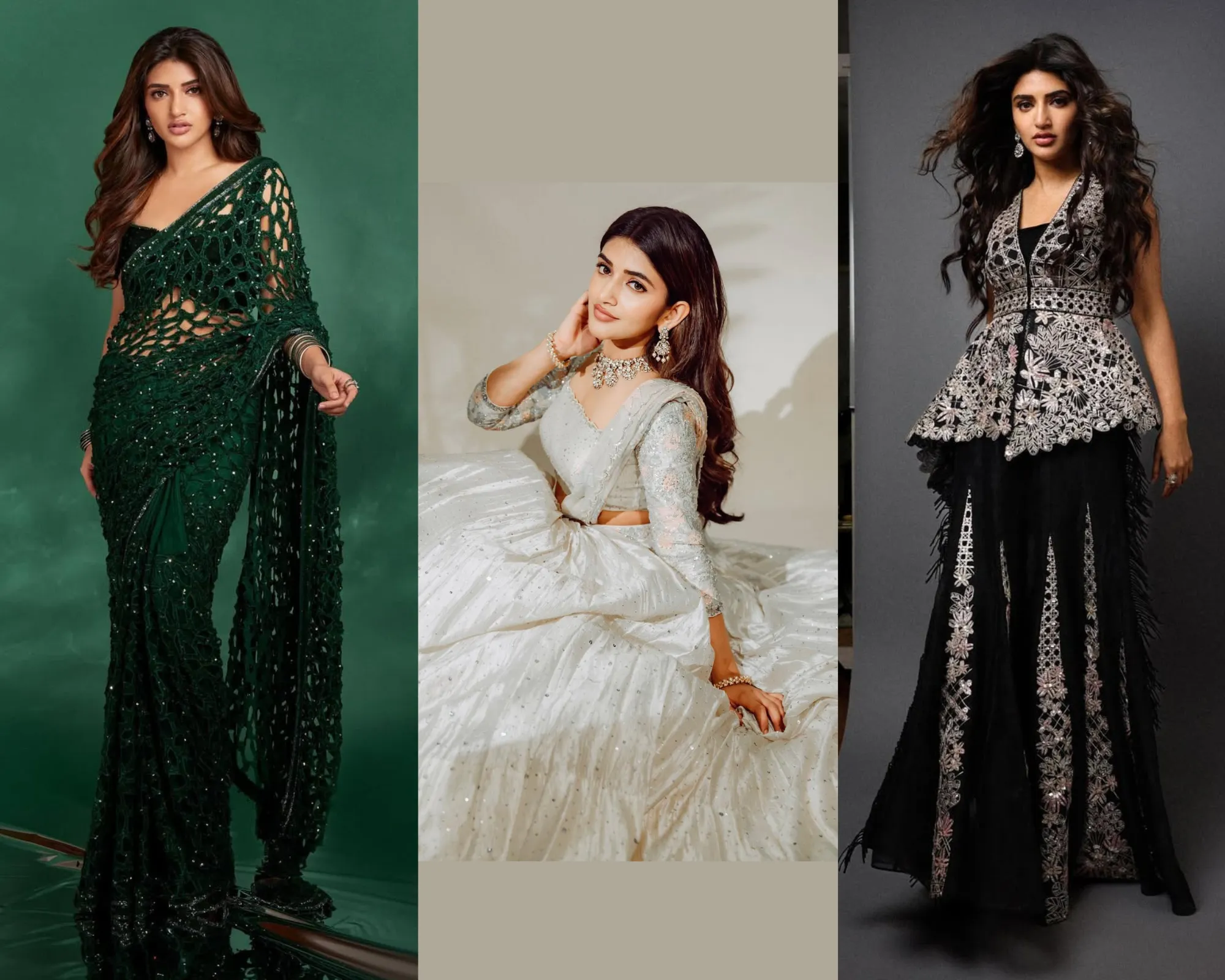 After researching through Sreeleela’s stunning social media posts and public appearances we can confidently say that one traditional ensemble that Sreeleela definitely slays is a saree. Perfect for a regal mehendi is this Bottle green cutwork saree by designer Sawan Gandhi. Embellished with sequins and paired with a butterfly-cut velvet blouse it is a sparkling choice for an evening festivity. Another shimmering choice can be this off-white Shimmer Drape Saree by designer Nitika Gujral. Adorned with tonal dori, beadwork feathers and silver crystals this georgette and net-drape saree will be an elegant choice for your sangeet!