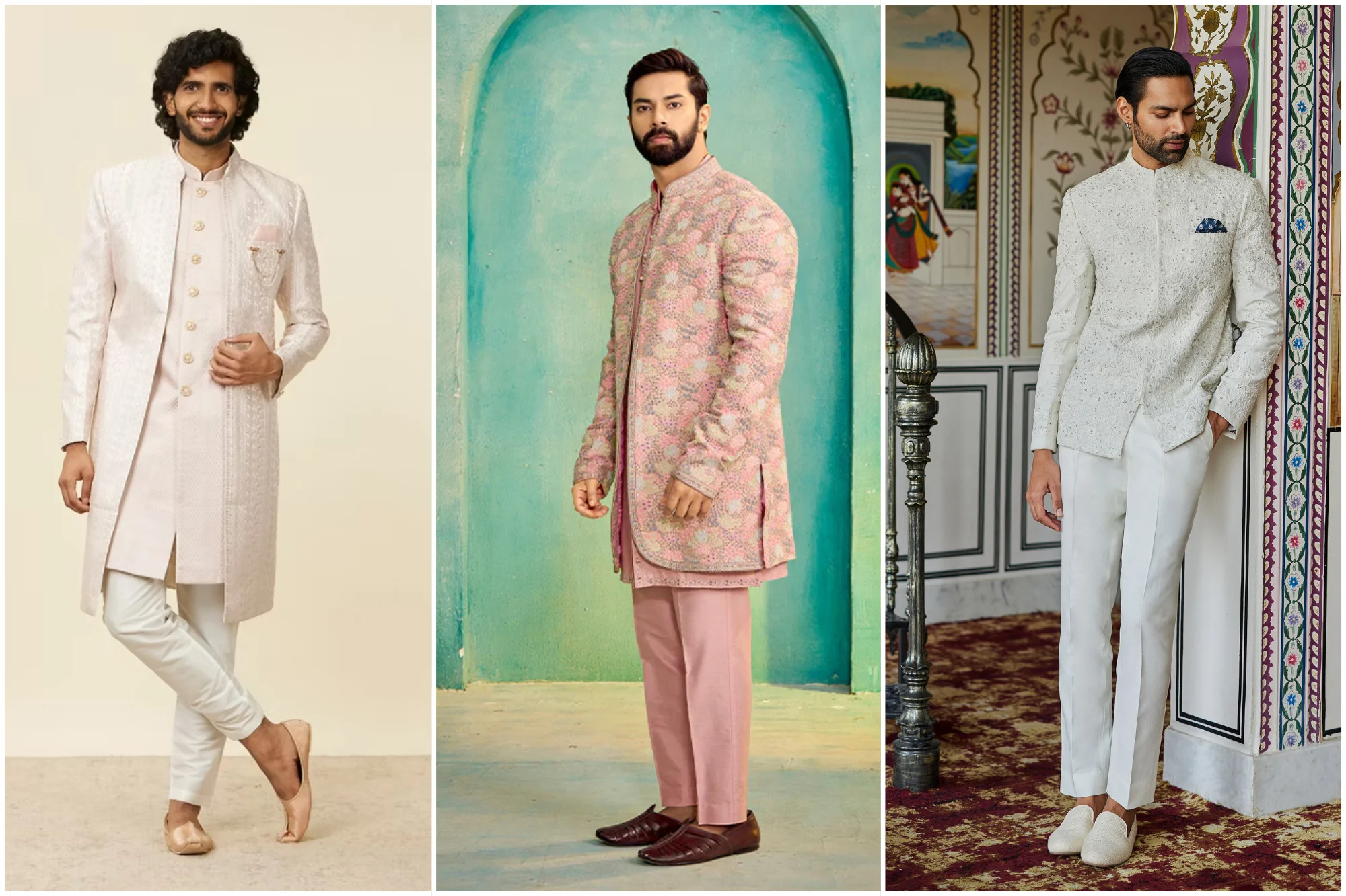 If there’s one garment that envelopes the groom in regal dignity, it is the timeless sherwani. For an elegant engagement, opt for a sherwani in lighter, soft pastel shades instead of those heavily embroidered wedding sherwanis. Pastel shades of ivory, blush pink, mint green, or powder blue are the perfect colour scheme for a day ceremony or an intimate night one too.