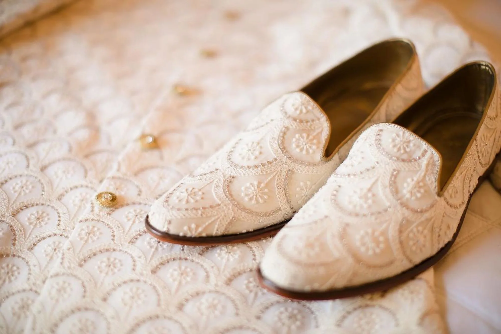 The best pick for the main event is traditional mojaris and juttis that go perfectly with ethnic ensembles. Look for silk or velvet bases with zari work, thread embroidery, beads or mirror work. Beige and ivory mojaris pair well with neutral sherwanis, while deep maroon, navy or emerald green complement jewel-toned outfits.