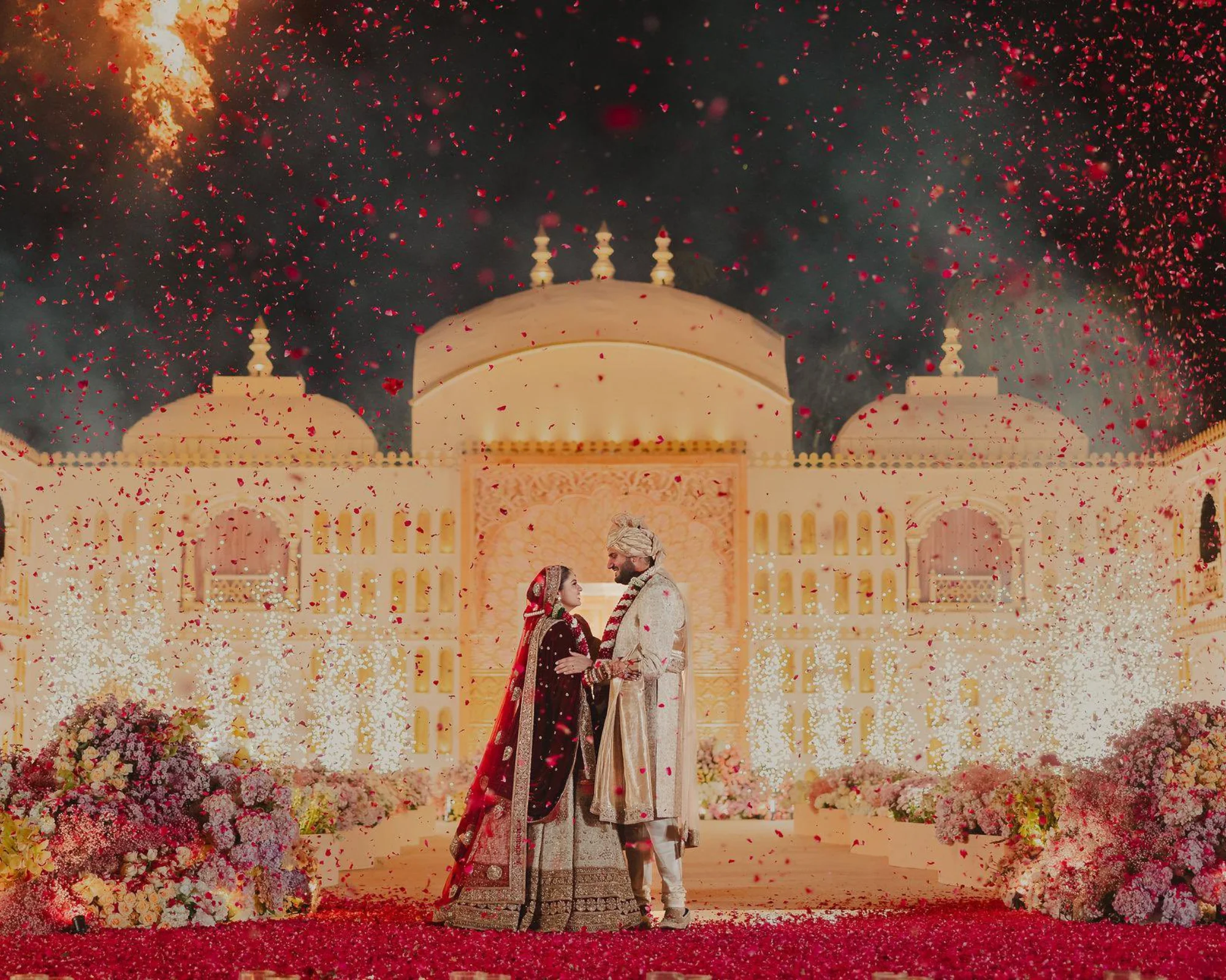 Their pre-wedding celebrations were also a spectacle in itself. Their mehendi ceremony was a vibrant celebration featuring the extensive use of handmade crochet flowers for decoration, rather than real ones. The venue was transformed into a vibrant, colourful jungle oasis for the event. It took 500 Indian artisans’ exemplary skills to transform Diva and Jeet’s dream mehendi fantasy into reality.