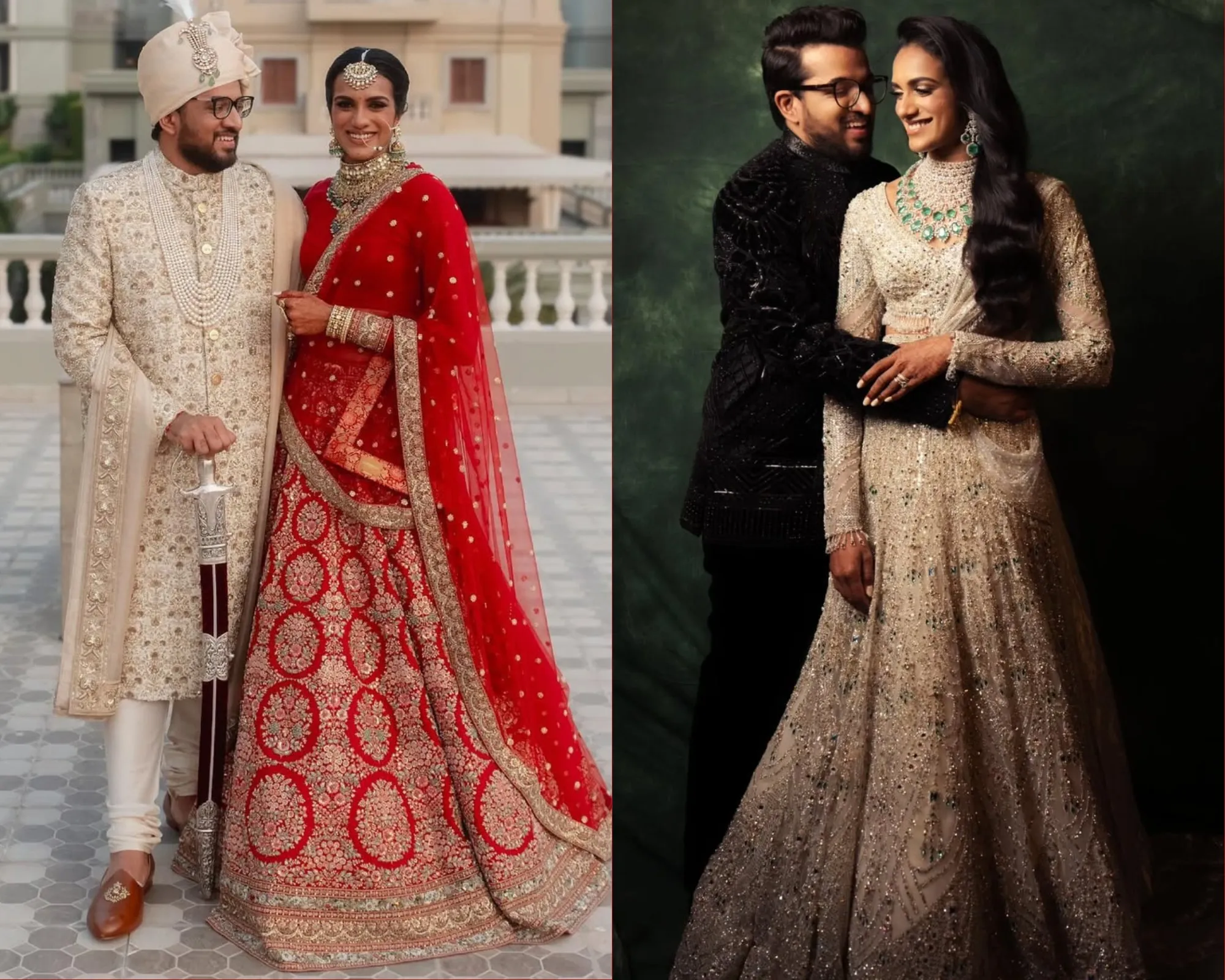 For her traditional Telugu-style wedding, PV Sindhu sparkled in an heirloom Manish Malhotra saree from the designer’s Evara collection, featuring gold and silver Ganga Jamuna threadwork with badla and zardozi embroidery. She completed her bridal look with a headveil embellished with zari borders with her and her husband’s names and paired the outfit with a multi-tiered imperial heirloom necklace, featuring Zambian emeralds and uncut diamonds from Manish Malhotra jewellery. Venkatta looked every bit of a royal groom in a Manish Malhotra brocade sherwani with delicate silver leaf arabesques. He elevated the ensemble with a stole and shaffa crafted with gold and silver tissue and a timeless dhoti.