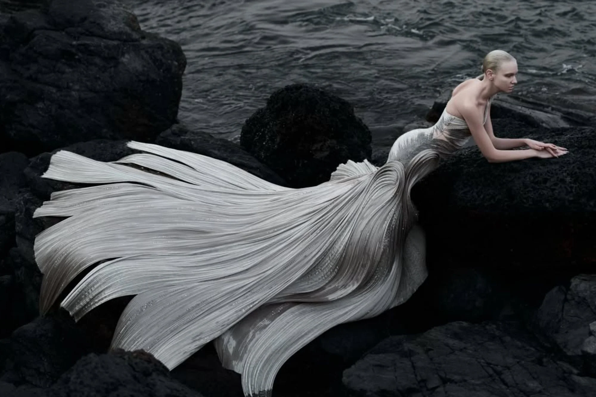 Some bridal wear takes a more literal interpretation of mermaid aesthetics, with layered organza or tulle mimicking the movement of waves and fins.
