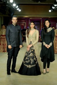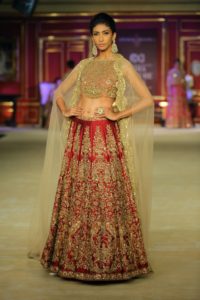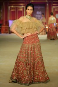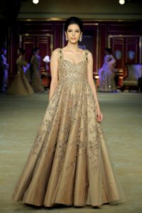 The garments in this collection include floor sweeping gowns, sheer tulle capes, ruffled blouses, supple frills, belted waists, kalidaar jackets and lehengas. The designers have extensively used sequins, iridescent crystals, stone encrusting, Fluid beadwork, dripping gold embroidery in floral setting and luscious gold thread work. They include ruffles sprinkled with glitter, tulle skirts and magnificent gowns with floral thread work creating a fantasy like ambience.