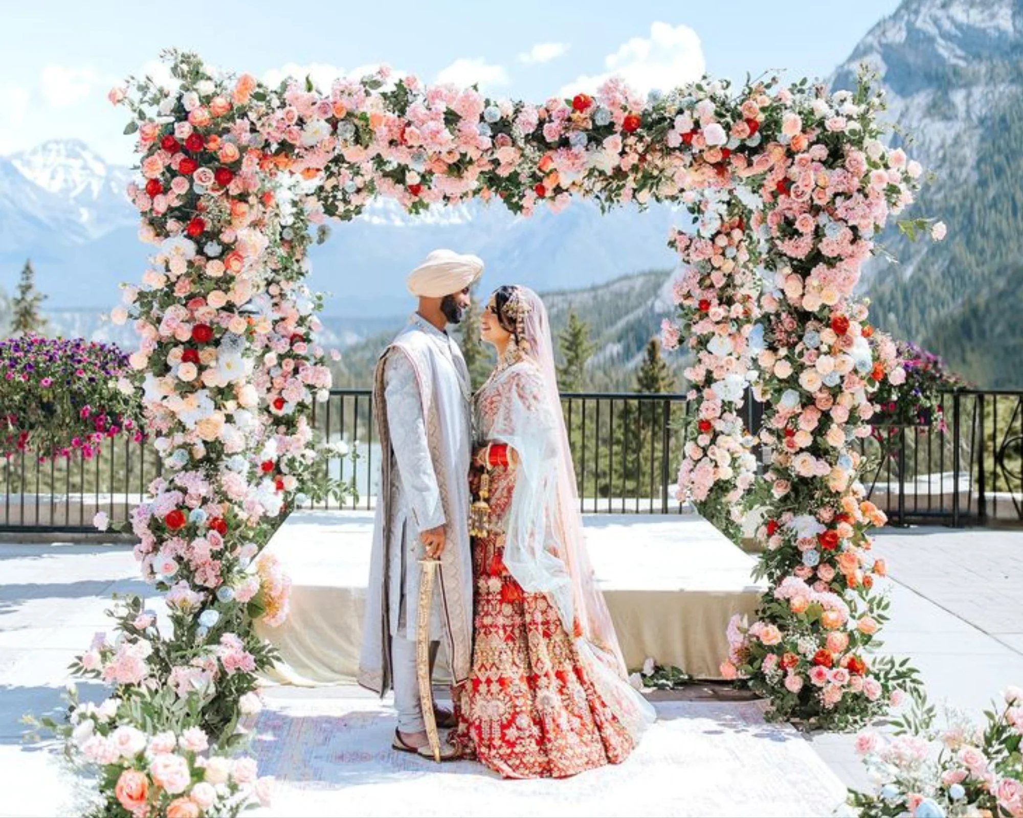 • Mandap: For the mandap decor, consider including components like a rustic wooden mandap frame adorned with fresh pine sprigs, frosted twigs, and cascading white blooms to incorporate the feel of snow-kissed forest to your pious saat vachans. If you want, you can also add extra sparkle through silver ornaments.