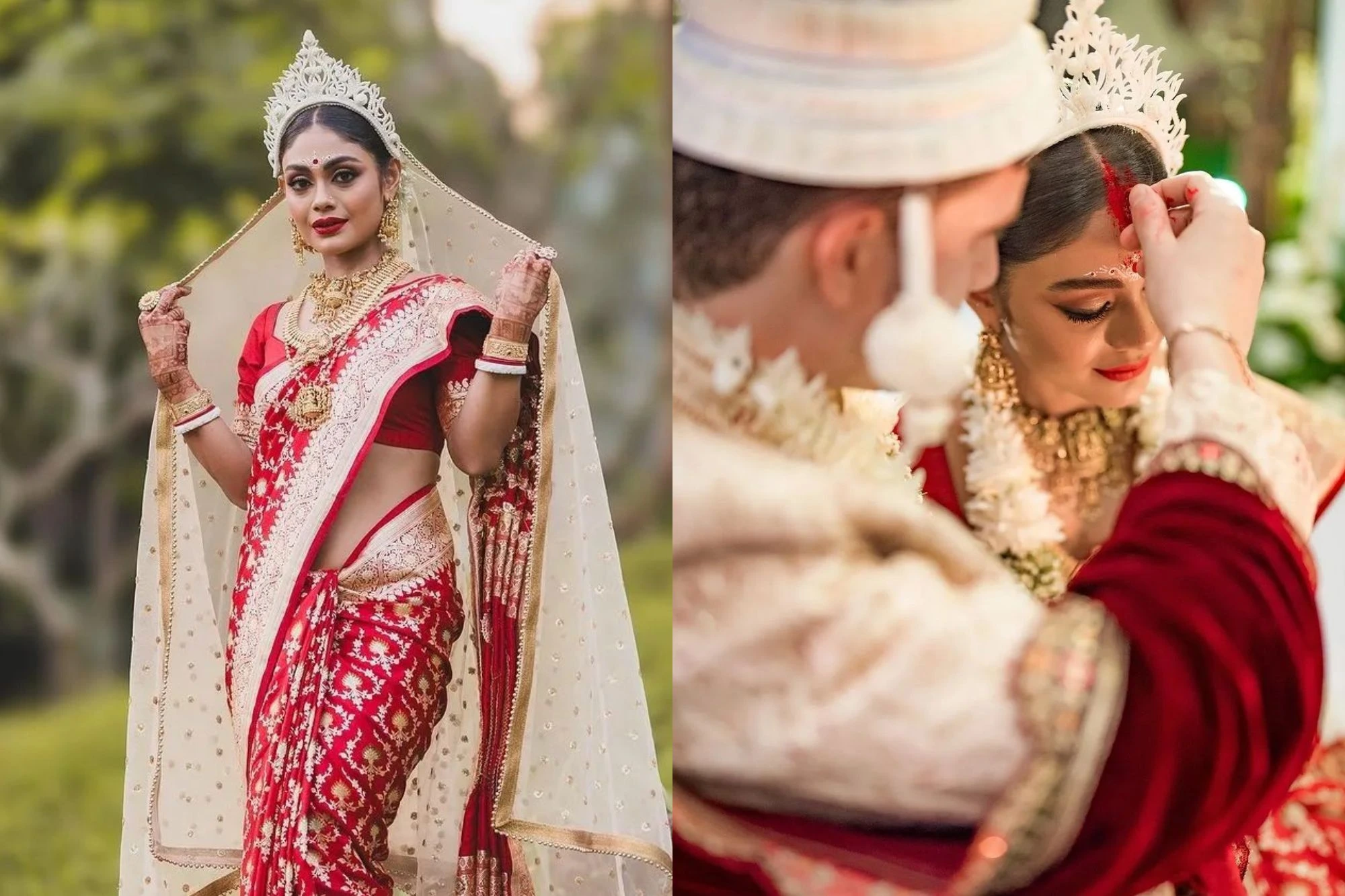 Sreejita looked absolutely mesmerising as a traditional Bengali bride for the wedding. She wore a classic red Banarasi saree, paired with stunning jadau gold jewellery including a statement choker and chooda bangles. She looked absolutely radiant as a bride with soft and elegant makeup. Her golden dupatta was held with a shola tiara, traditionally worn by Bengali brides. Another classic Bengali adornment in her look was the sankha-pala bangles. Michael complemented his bride beautifully in a peach kurta with a jacket and pyjama. He wore a traditional topor or mukut, looking dashing as an authentic Bengali groom. He finished his look with white dhoti pants and a maroon doshala.