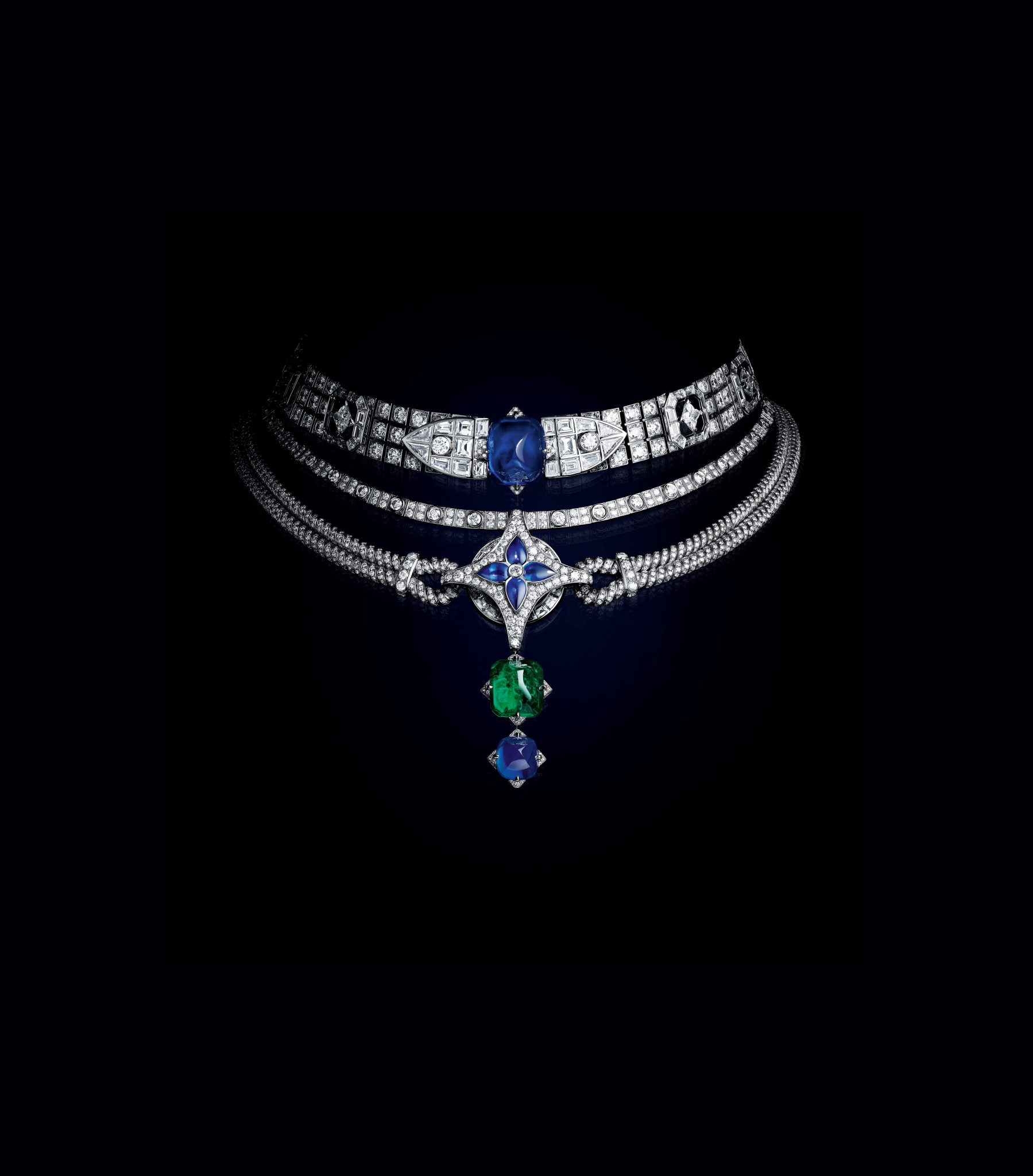 Le Mythe necklace from Louis Vuitton’s Bravery high jewellery collection has all of the Maison’s signature styles. The multi-layered necklace has various classic Louis Vuitton motifs- the Damier pattern, trunk lock-inspired details, studs, rope, and the iconic Monogram flower. The triple row necklace has a 19.3-carat blue Sri-Lankan sapphire, 8.64-carat emerald and a vibrant 7.11-carat Madagascan sapphire adorn the beautiful necklace from which the emerald and Madagascan sapphire, all detachable. The necklace can amusingly change into 12 different prodigious forms.