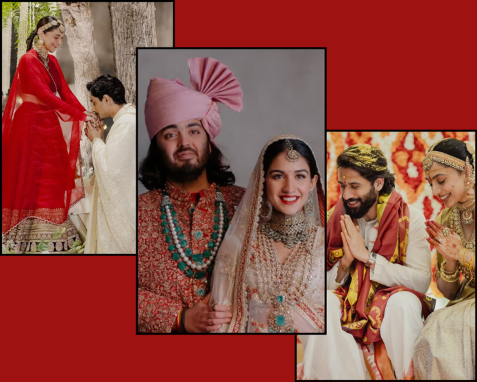 While lavish wedding affairs were praised by all, the charm and authenticity of a traditional wedding remained constant. The most popular celebrity weddings of the year was one where actress Sobhita Dhulipala and actor Naga Chaitanya tied the knot on December 4th, 2024 in a traditional Telugu wedding held at the Akkineni family’s Annapurna studio. While the bride adorned a traditional handwoven Kanjeevaram saree by designer Gaurang Shah, the groom adorned the madhuparkham attire with a white pancha featuring a bold red border paired and a simple yet elegant white kurta. The ceremony was filled with traditional rituals and many celebrities from the South Indian film industry were present at the wedding including Venkatesh and Rana Daggubatti.