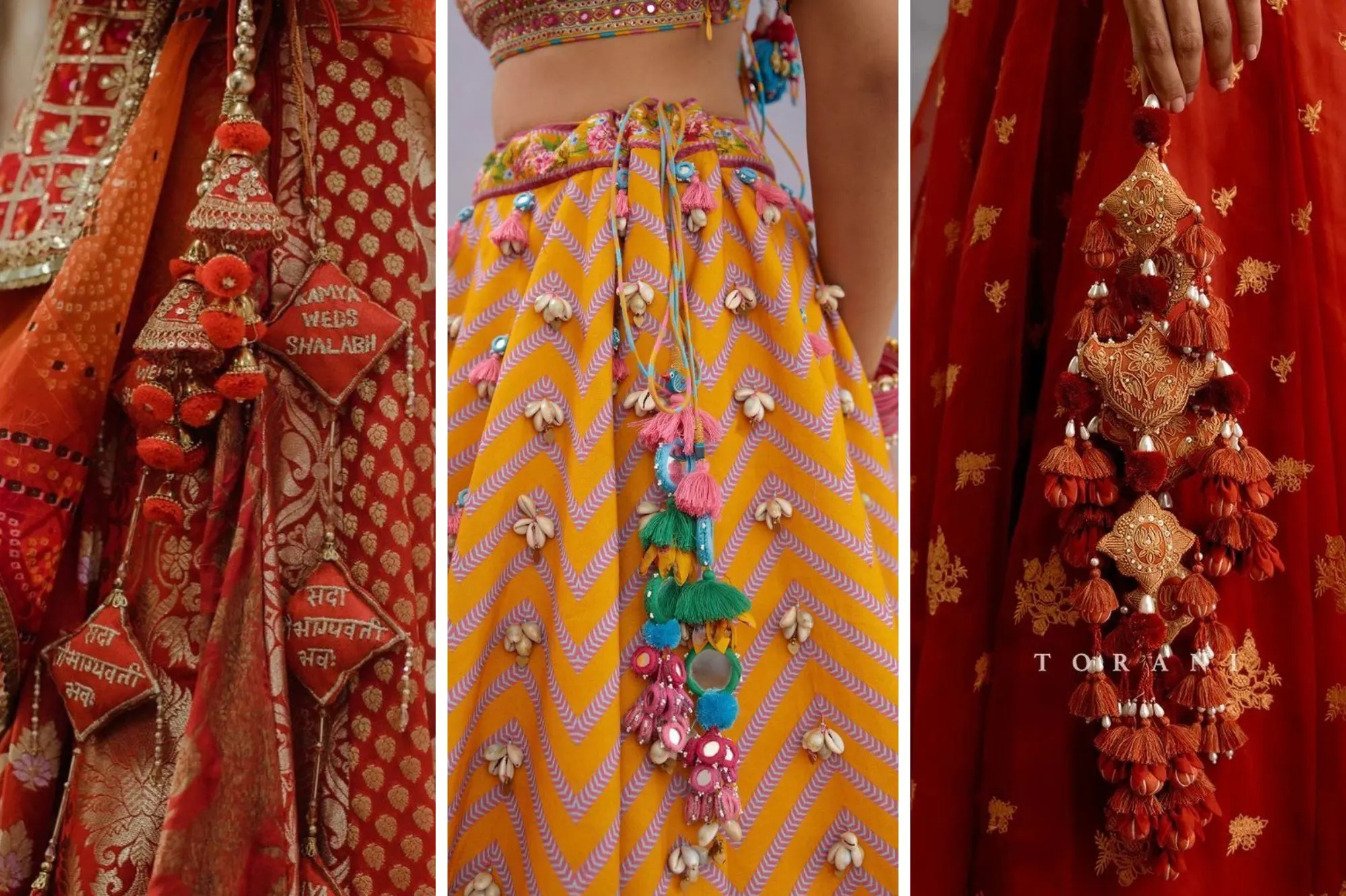 This one’s for the bride who loves details. Personalised latkan ideas are blowing up everywhere right now! You can get your names, wedding dates or even cute phrases like “Pataka Bride” embroidered or printed on the tassels. It’s a fab way to make your outfit more ‘you’. Also, as a bonus, it makes for the perfect close-up shot in your wedding video.