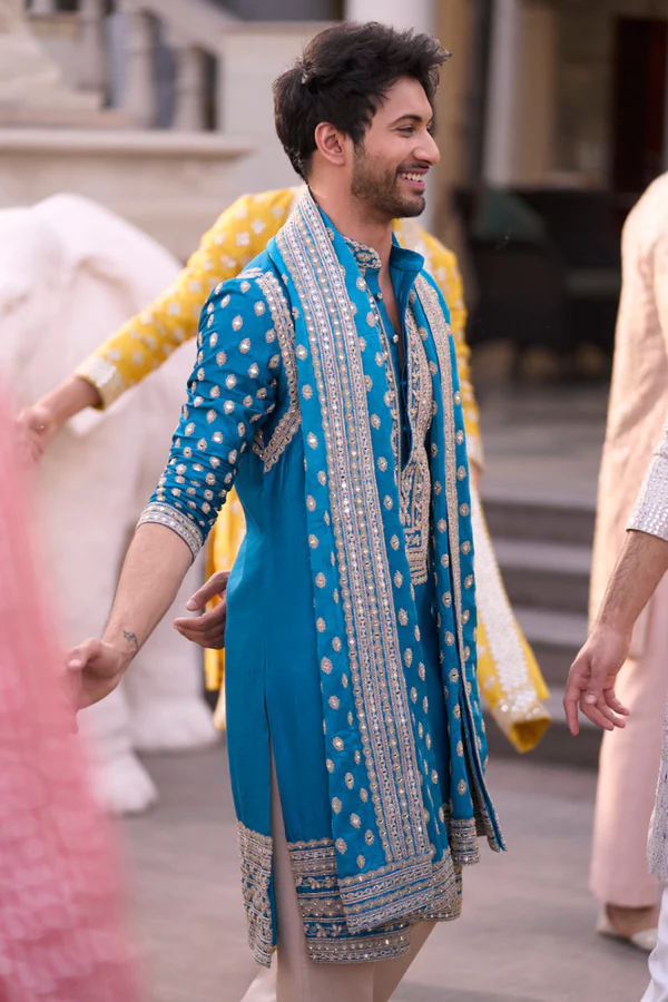 Look just as vibrant as him by donning this Celestial Kurta and Stole by designer Abhinav Mishra