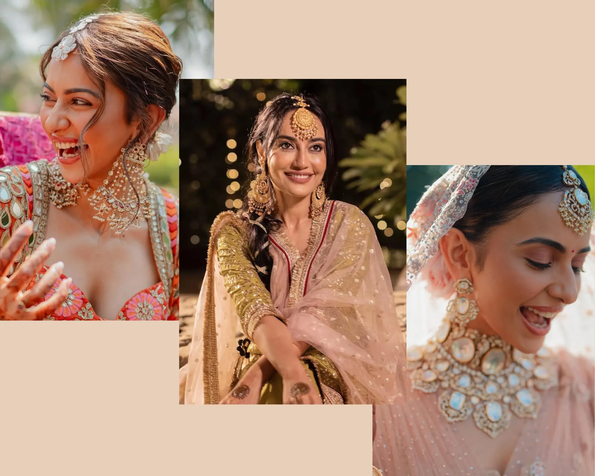 Statement jewellery pieces have been one of the most viral wedding jewellery trends of 2024. Ditching the bygone trend of dainty jewellery brides have gone for maximalism in the boldest way ever. Rakulpreet donned a pair of chunky earrings for her mehendi and a diamond and polki necklace for her wedding day. Similarly, Surbhi Jyoti opted for a heavy maang tikka paired with chunky earrings for her mehendi and a diamond and emerald polki necklace for her vows.